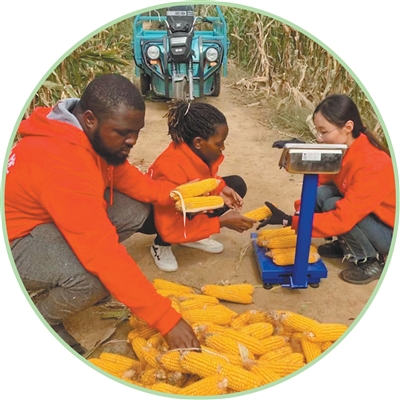 在河北曲周县试验田,塞姆(左一)和同学一起给玉米称重。